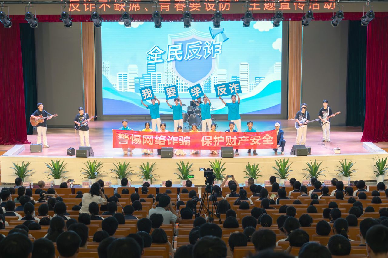 活动现场,渝北区反诈中心民警邓瑶进行了反诈宣讲。通过一个个妙趣横生的问题,邓警官循循善诱又“直击灵魂”,学生们跟随邓警官的节奏“秒懂”了诈骗套路,进一步掌握了防范要领。现场还上演了由学生自编自演的反诈歌曲节目《我要学反诈》,用青春的方式传递“反诈是门必修课、每个人都要学反诈”的理念。